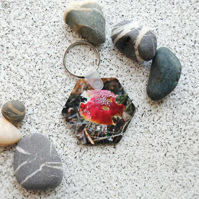 Sublimated wooden key ring, double sided same image both sides, between 5cm to 7cm diameter (3mm thick)